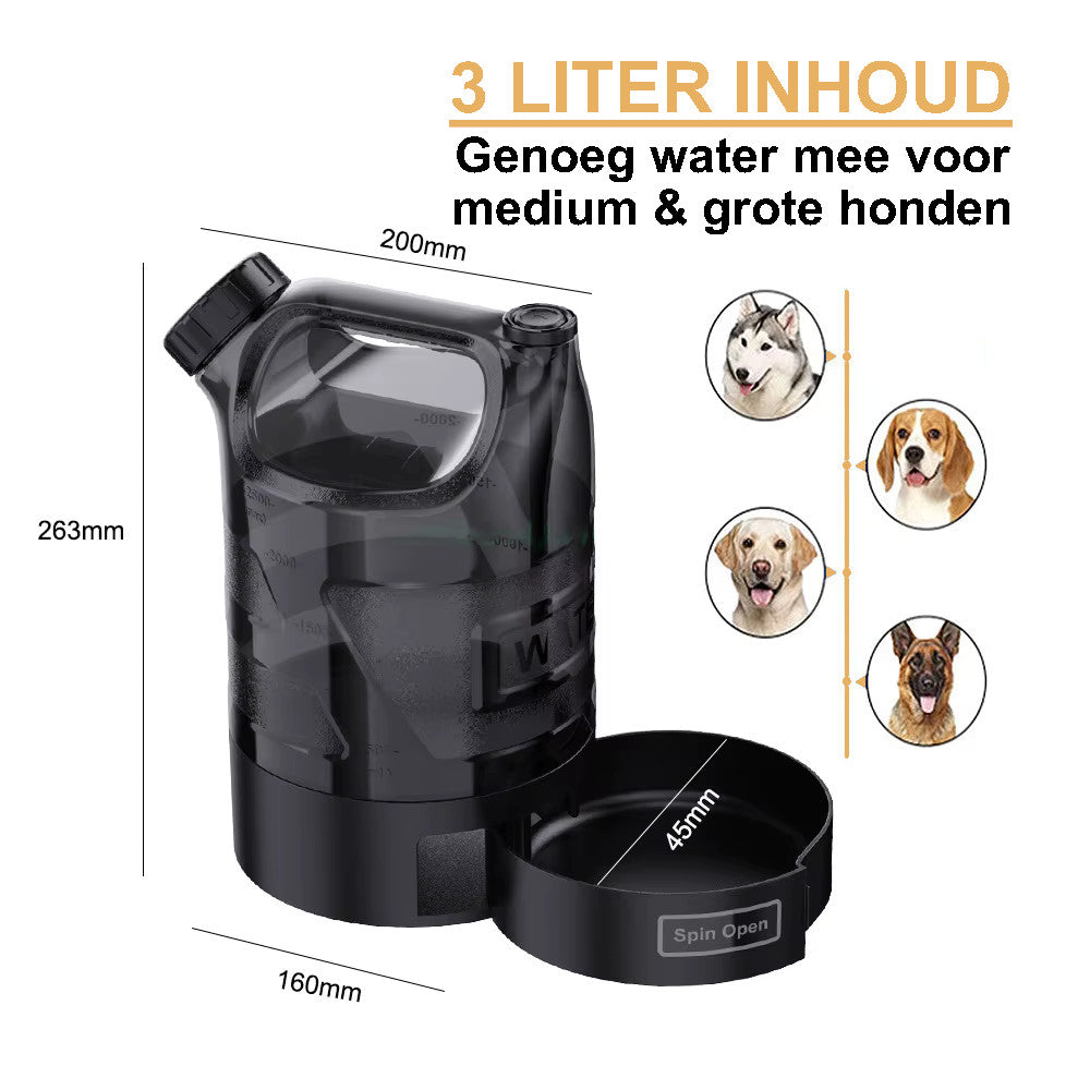 Deze ruime waterdispenser van 3 liter is speciaal ontworpen voor hondeneigenaren die onderweg of tijdens outdooractiviteiten hun viervoeter gehydrateerd willen houden. Of je nu gaat wandelen, kamperen of een dag op pad bent – deze waterfles is de perfecte metgezel voor jou en je hond.