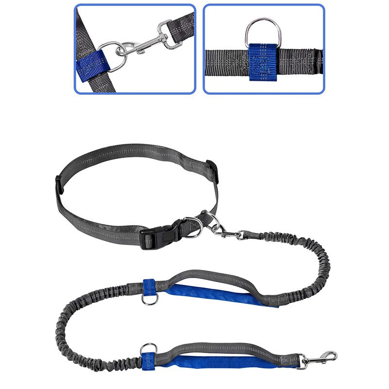 3. Bungeekoord voor Comfort: Onze hondenriem is uitgerust met een bungeekoord om schokken op te vangen en een soepele wandelervaring te bieden. Dit zorgt voor minder stress op jouw armen en rug en biedt comfort aan zowel jou als je honden. Het elastische koord absorbeert schokken bij plotselinge bewegingen, waardoor het wandelen aangenamer wordt.