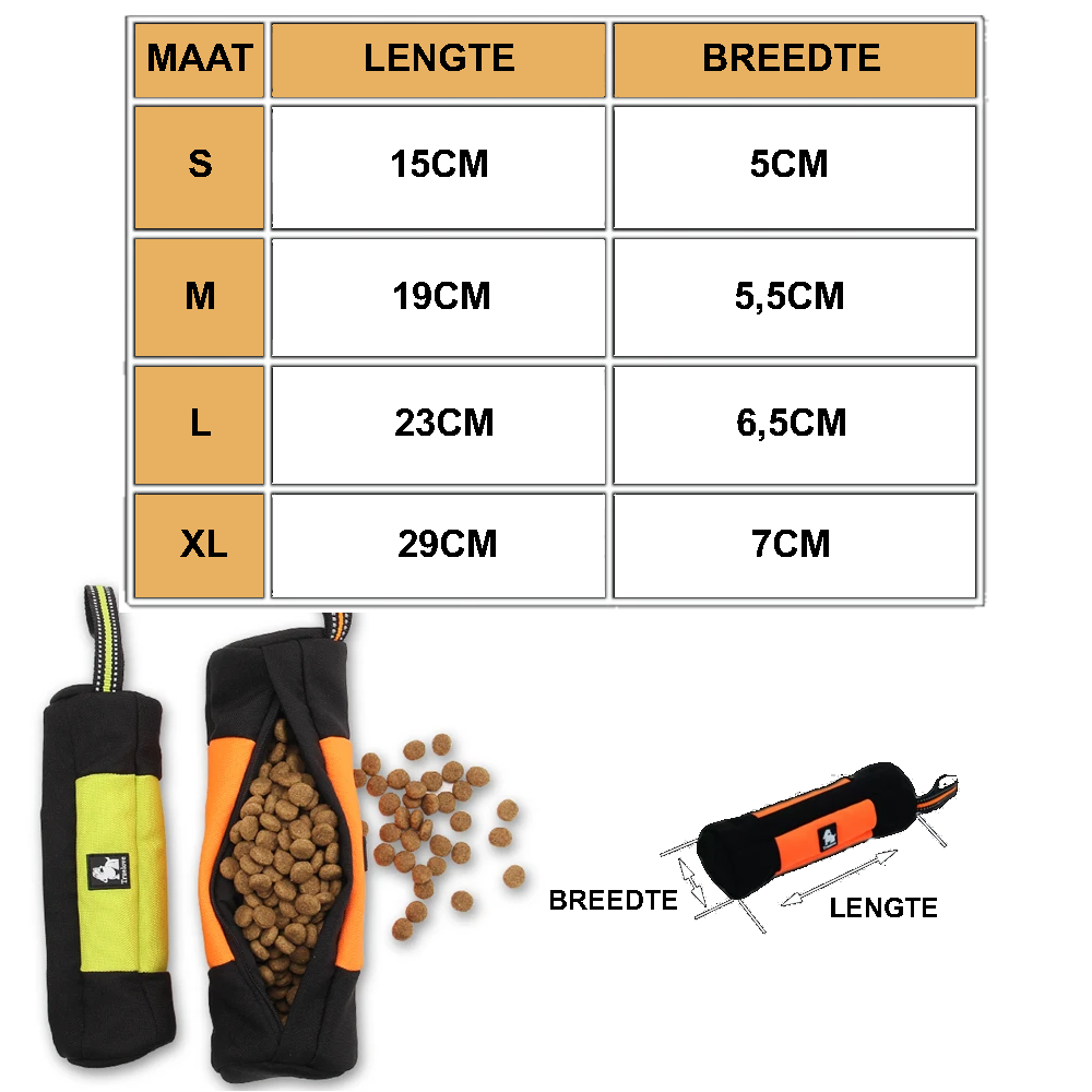 De voerzak is speciaal ontworpen om het trainingsproces soepel en gemakkelijk te maken. Gemaakt van duurzaam en slijtvast materiaal biedt de voerzak langdurige prestaties, zelfs bij intensief gebruik. Het heeft een riem, zodat je het comfortabel kunt dragen tijdens het trainen van je hond.