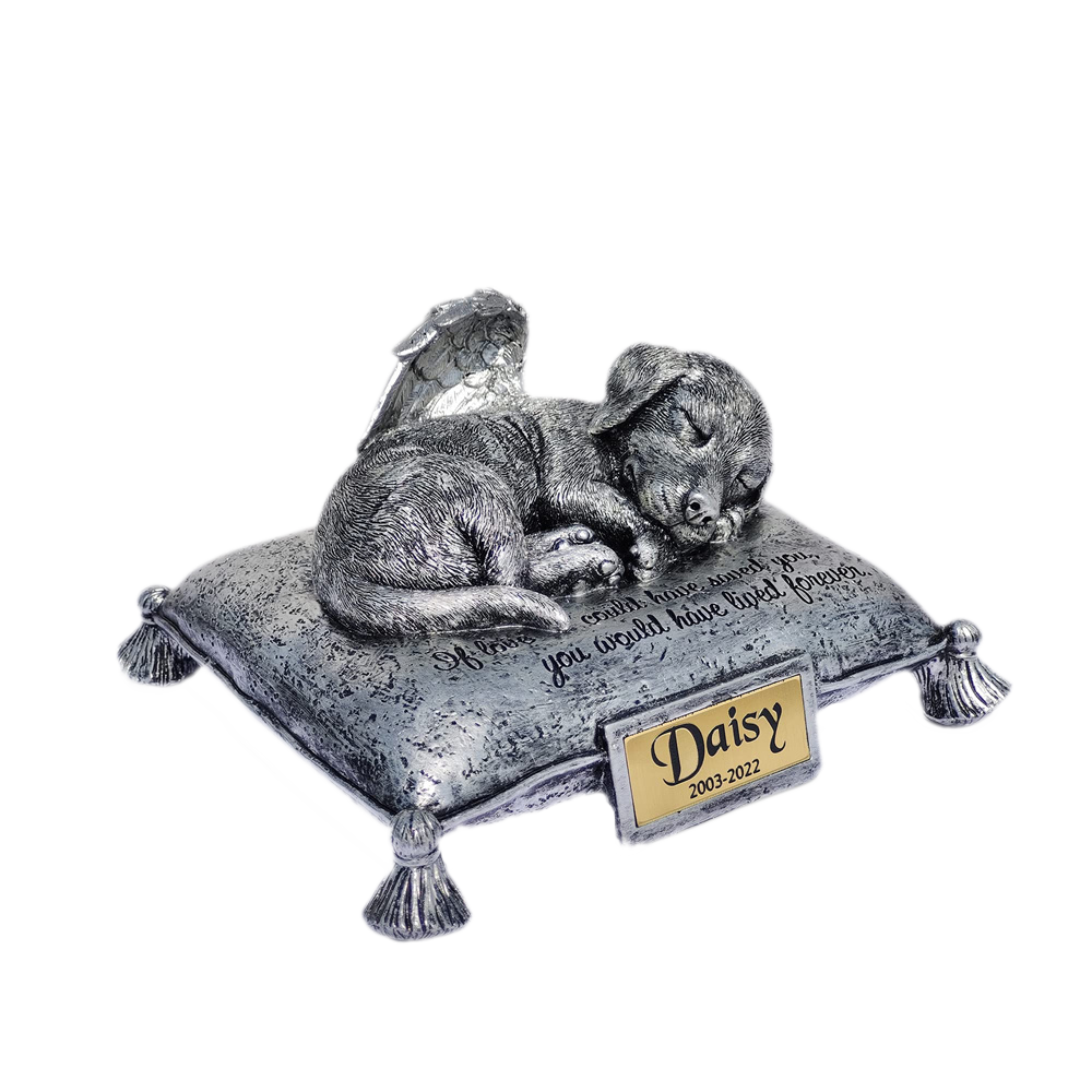 Deze urn voor honden heeft een ontwerp dat recht uit het hart komt: een teder rustend figuur van een hond, liggend op een zacht kussen. De serene uitdrukking op het gezicht van de hond straalt rust en vrede uit, terwijl het kussen symbool staat voor de comfortabele plek die jouw trouwe metgezel in jouw hart heeft ingenomen.