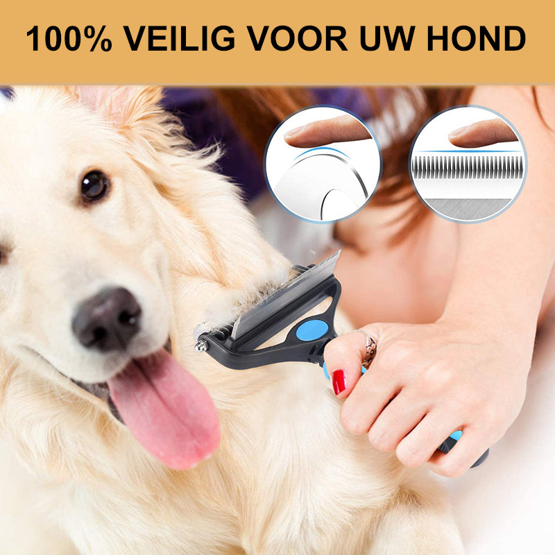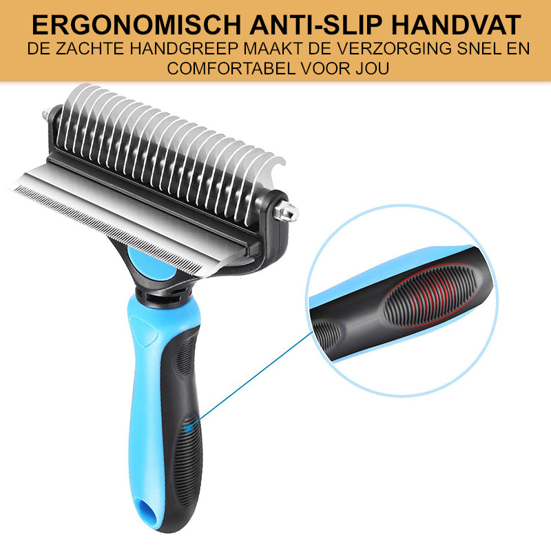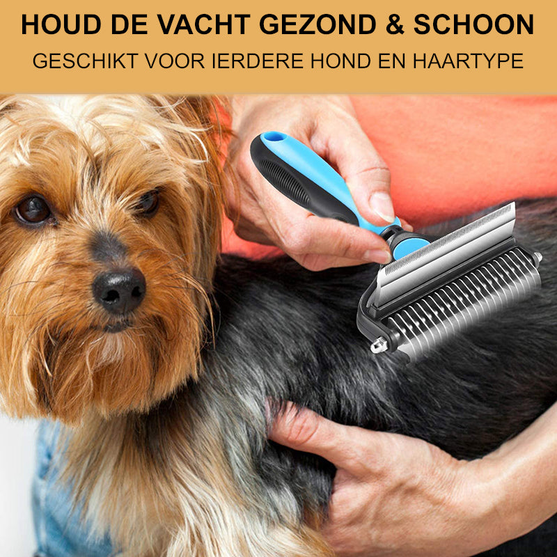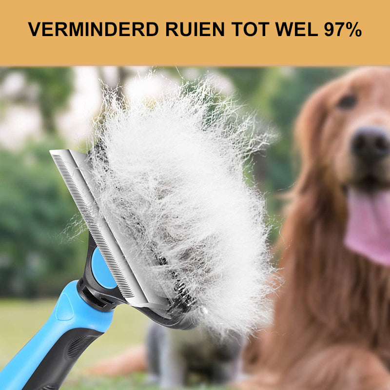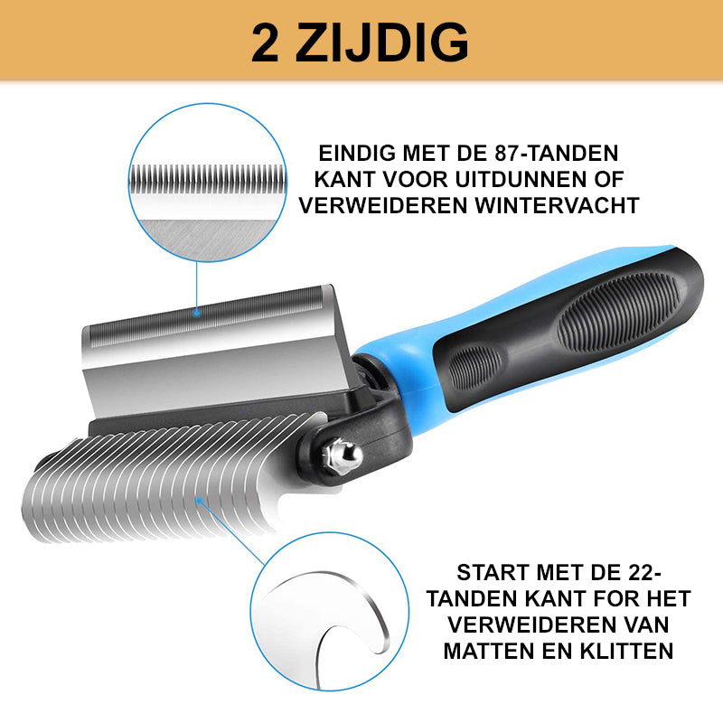 Twee-in-één functionaliteit: Deze borstel is een waardevol hulpmiddel dat twee belangrijke functies combineert in één handig ontwerp. Met de 22 tanden zijde kun je gemakkelijk de knopen en klitten uit de vacht van je hond verwijderen, terwijl de 87 tanden zijde perfect is voor het verminderen van losse haren en ondervacht tijdens de rui-periode.