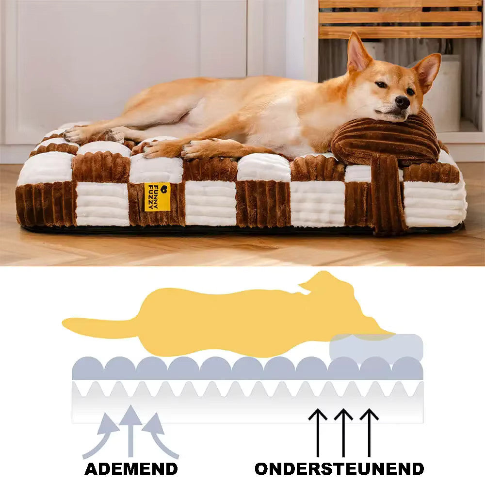 Het hart van dit hondenbed is het traagschuim matras pluche. Dit hoogwaardige materiaal vormt zich naar het lichaam van jouw hond en biedt optimale ondersteuning voor de gewrichten en de wervelkolom. Hierdoor kan jouw hond genieten van een diepe en herstellende slaap, waardoor eventuele pijntjes en ongemakken verminderd worden.