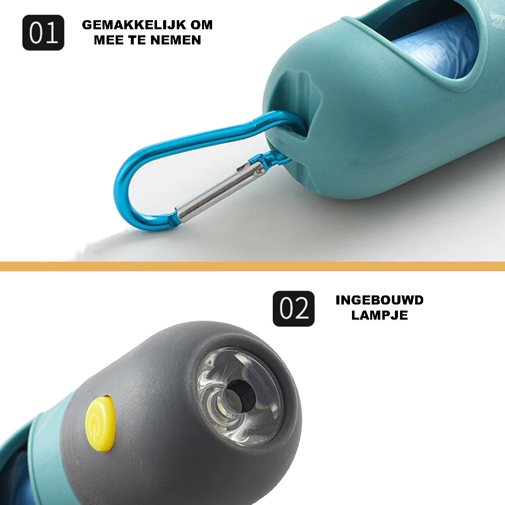 Met een ingebouwd lampje biedt deze houder je de perfecte verlichting, zodat je zelfs tijdens late avondwandelingen of vroege ochtendtochten moeiteloos de kak van jouw hond kunt opruimen. Geen gedoe meer met zaklampen of het gevaar van slecht zicht - met dit handige lampje heb je altijd helder zicht op wat je doet.