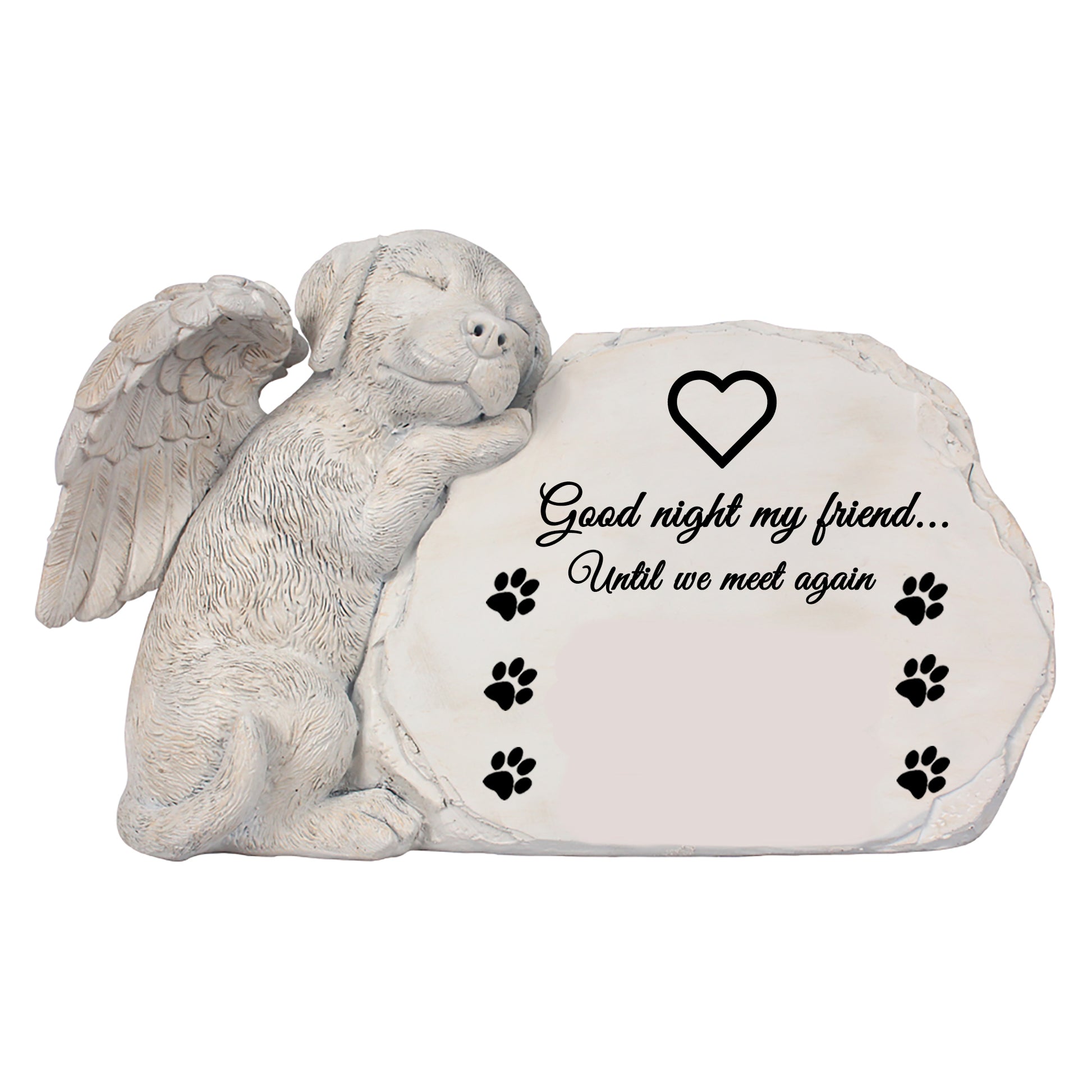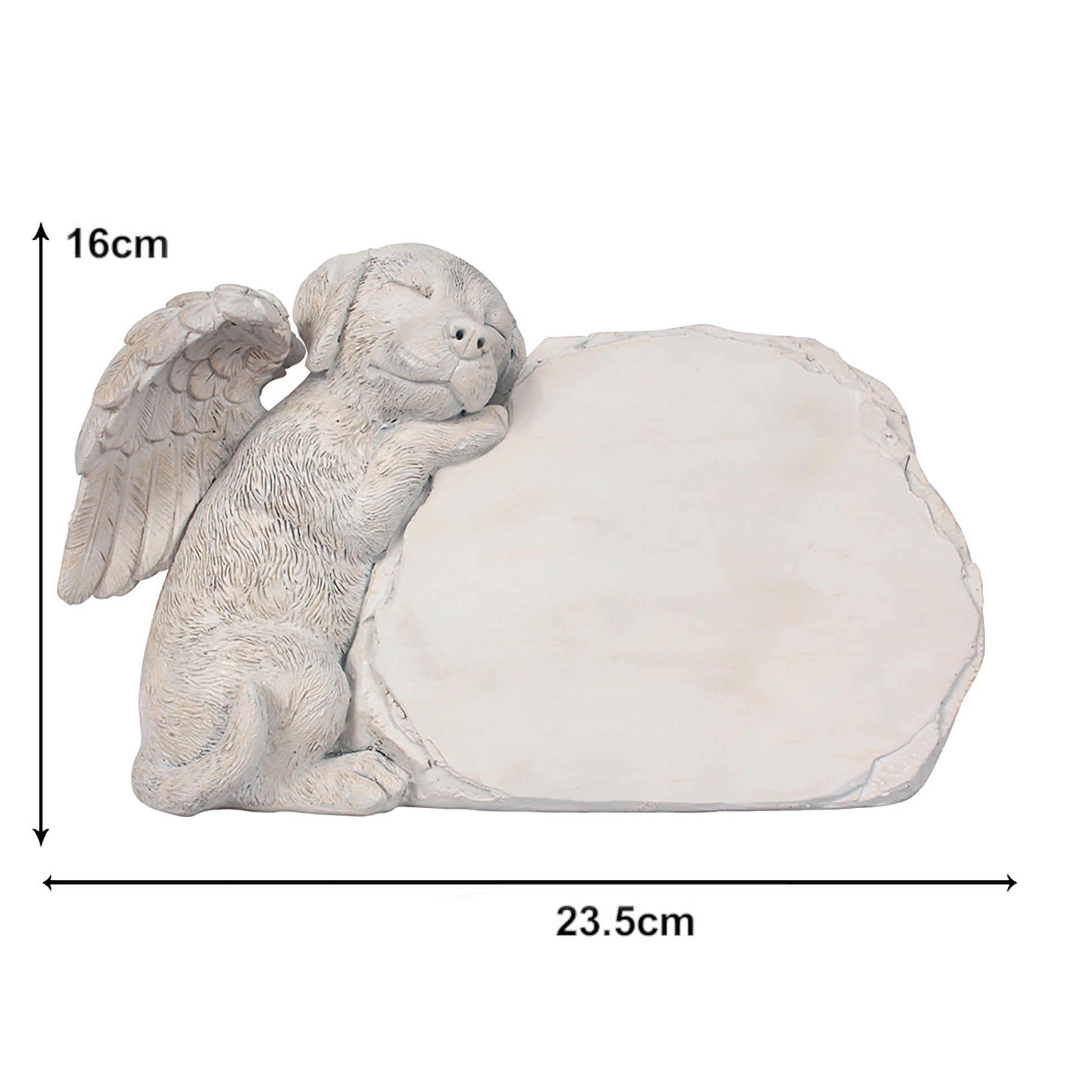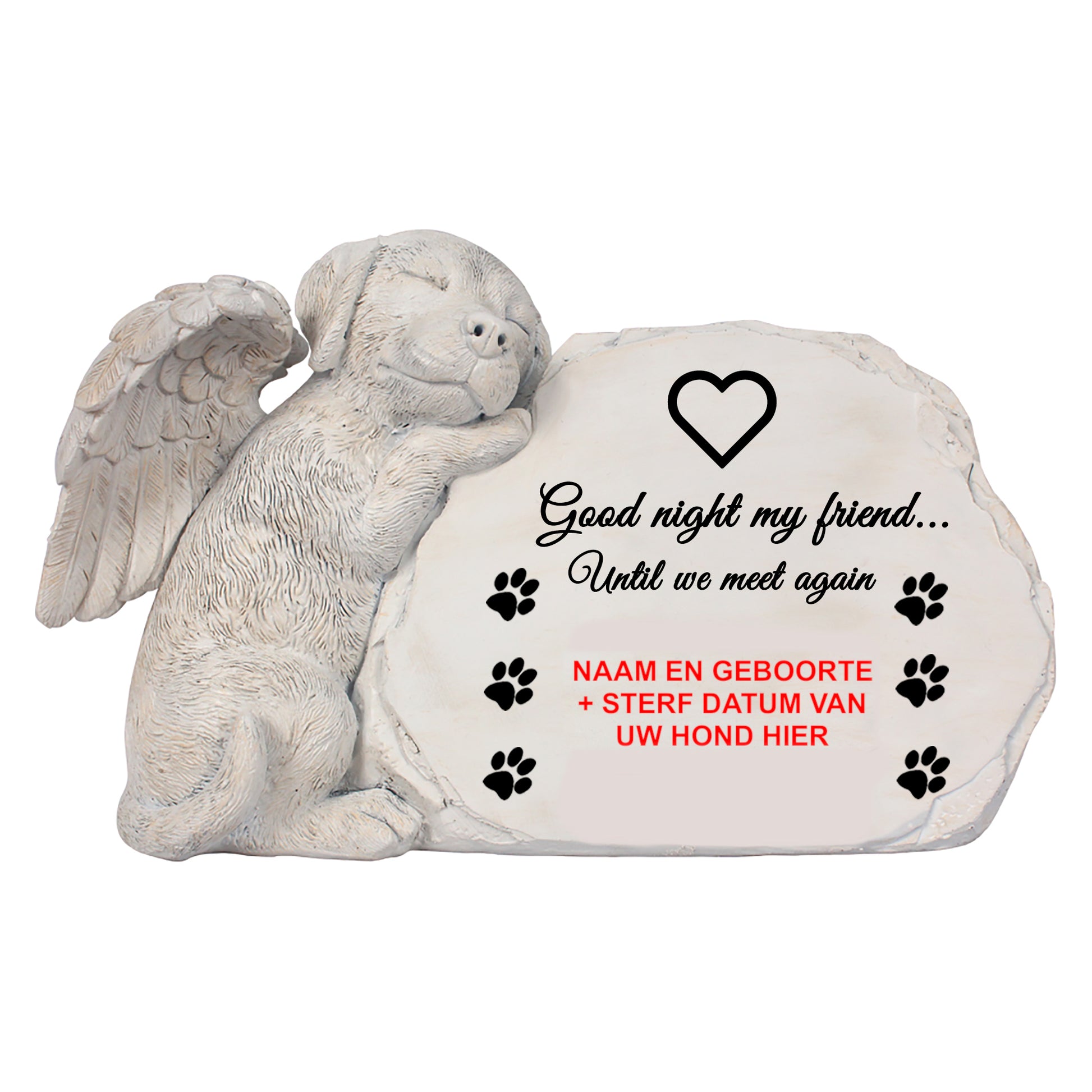 Deze gedenksteen is niet alleen een marker voor de speciale plek die je voor je hond hebt, maar ook een prachtig eerbetoon dat recht doet aan de diepe gevoelens die je koestert voor je trouwe metgezel. Het zorgvuldig ontworpen beeld en de aandacht voor detail in de engelenvleugels en het zachte, liefdevolle gezicht van de hond stralen een gevoel van vrede en sereniteit uit, waardoor deze gedenksteen een tastbaar symbool wordt van jouw onverbrekelijke band met je geliefde huisdier.